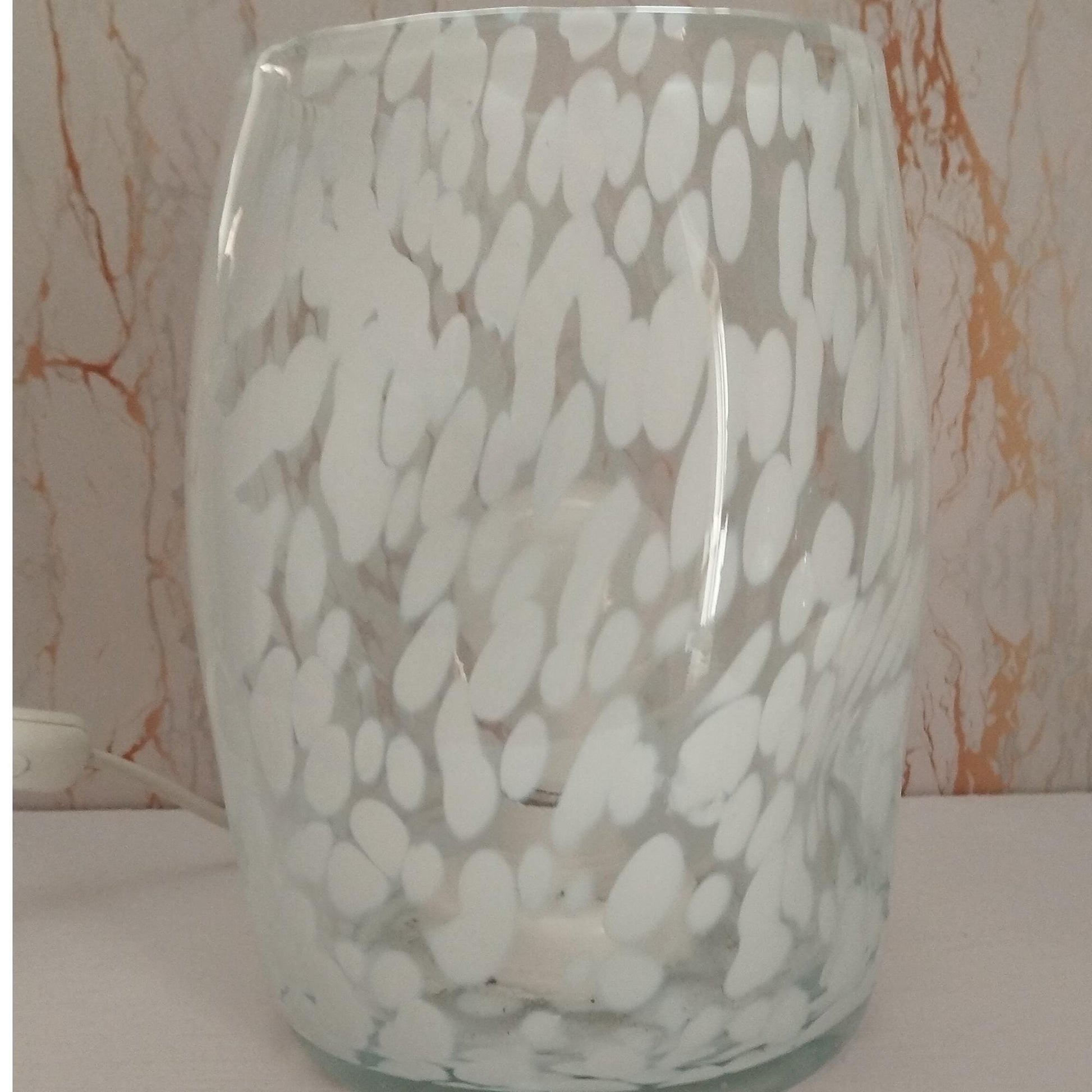 This handcrafted glass lamp brings a touch of artisanal charm to any space with its unique white frosted pattern, designed to create a warm and inviting glow.
