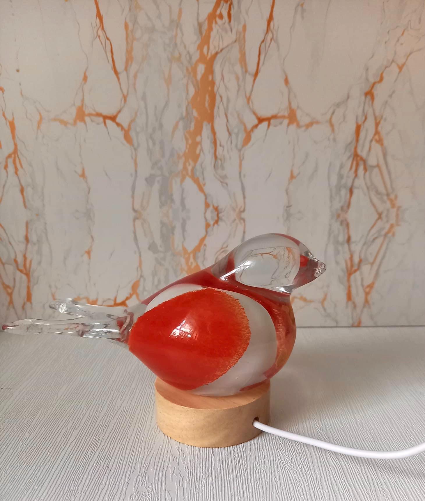✨ Features: Handmade & One-of-a-Kind – Each lamp is individually crafted from high-quality blown glass, meaning no two are exactly the same. Charming Bird Design – The glass bird shape brings whimsy and warmth, perfect for cozy corners, bedside tables, or display shelves. Iridescent Glow – The glass shimmers with subtle color shifts, creating a magical atmosphere when the LED light is on. Energy-Efficient LED – Provides soft, ambient illumination that’s long-lasting and safe. Ready to Use – Powered via USB cable, making it easy to place anywhere in your home (must remain plugged in during use).