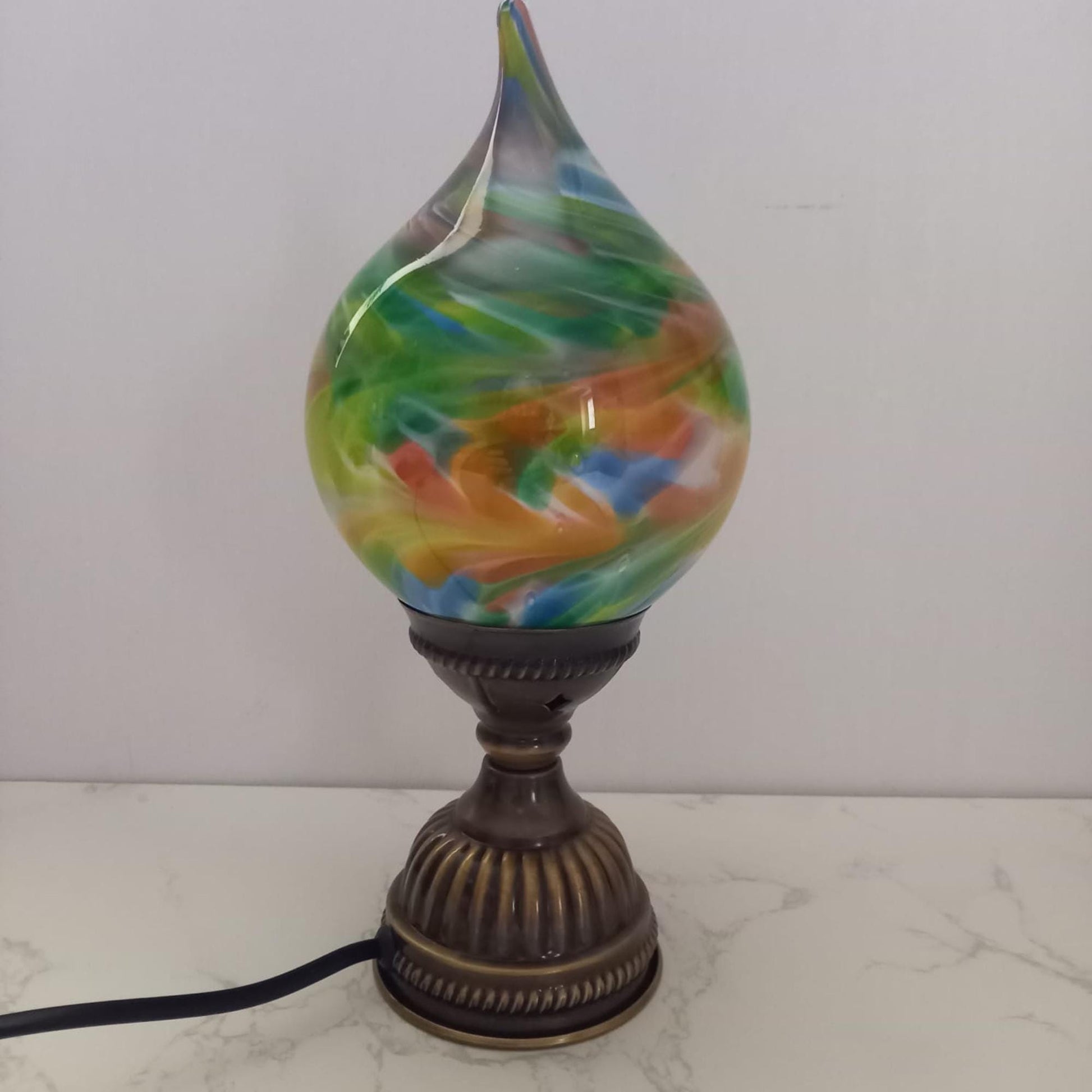 Handcrafted by Joseph, a 73-year-old artisan with a deep passion for glasswork, this lamp is set on an intricately designed bronze base, adding a touch of vintage charm to its modern artistic flair. The Mystique Flame Glass Lamp is perfect for creating an ambient glow, ideal for living rooms, bedrooms, or as a centrepiece in your home decor. Its unique design and mesmerising colours make it an eye-catching statement piece, while the gentle illumination from a standard bulb (not included) adds a cosy and inviting atmosphere. Available in a variety of colour patterns, each lamp is one-of-a-kind, bringing an artful and personal touch to any room.