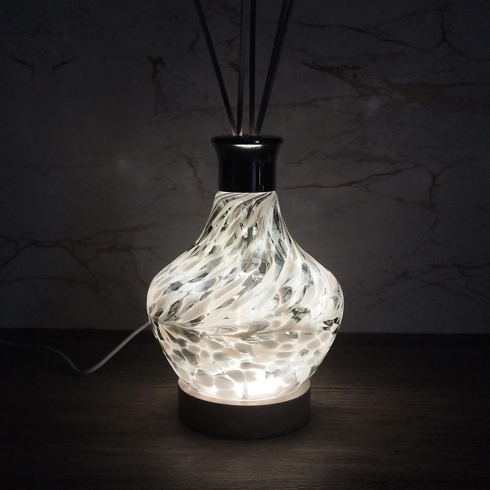 Crafted from premium iridescent glass, this elegant diffuser not only disperses your favourite aromas but also doubles as a captivating decorative lamp. Perfect for creating a relaxing ambiance, the integrated LED light highlights the iridescent colours of the glass, adding a warm glow to any room. Whether you're using it for aromatherapy or as a mood light, this diffuser lamp is a versatile and unique addition to your home decor.